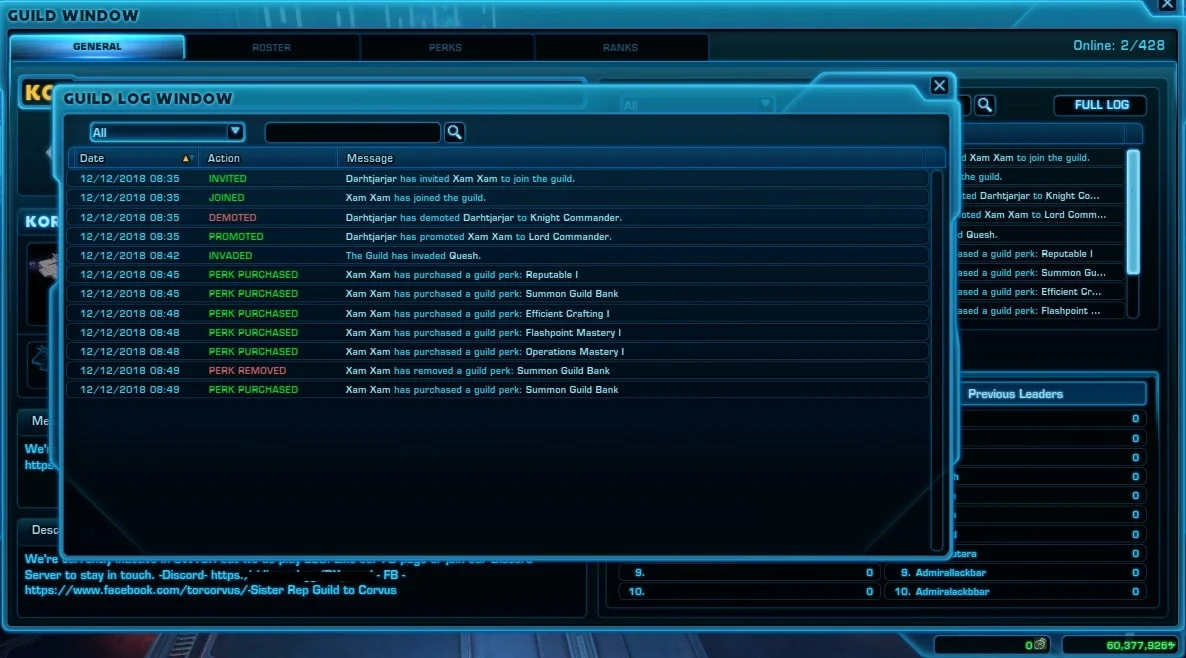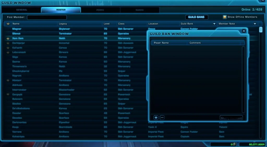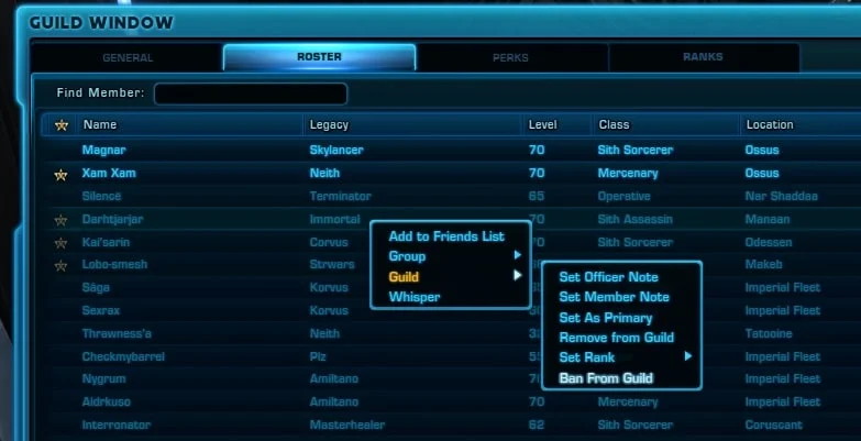 The Guild Roster allows you to see all the members of your Guild. It can be sorted in ascending or descending order by Name, Legacy, Level, Class, Location, Guild Rank and Member Note. You can also choose if you want to see offline members or not. Note the search window is case sensitive.