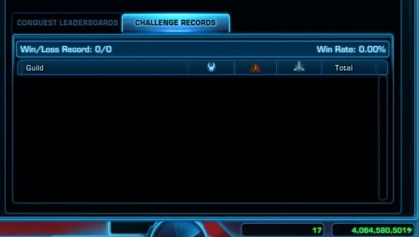 Displays the top 10 Conquest Point earners for the current week and previous week. Also displays PvP Challenge Records from when your Guild has challenged other Guilds. It is sortable in ascending and descending order by Guild Name and the type of match ie. Galactic Starfighter, Warzones and Ranked Warzones.