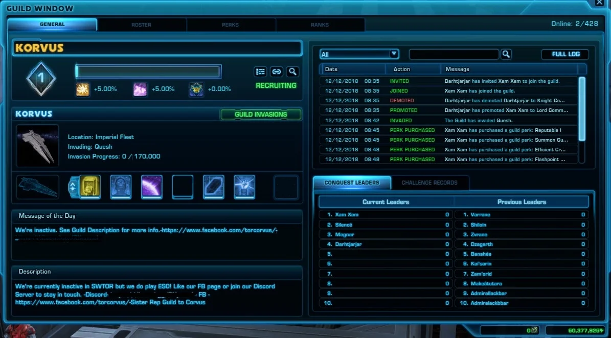 The Guild Level is displayed in the top left along with the Guild Name, XP Bonuses and Recruiting Tools. (You can read more about Guild Levelling in my Guild Levelling System Guide). You can also see which perks are active as well as the invaded planet and invasion progress. Below is the Guild Description and Message of the Day. On the right side, is a Guild Log as well as Conquest and PvP Challenge Leaderboards.