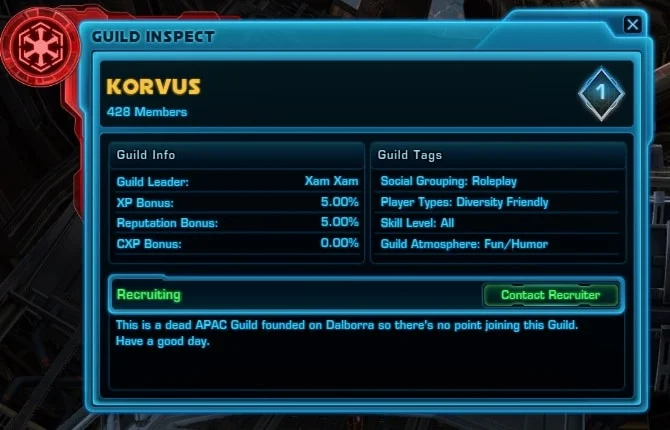 The Guild User Interface has gotten quite a facelift to accommodate all the Guild Improvements coming to The Old Republic in Game Update 5.10. Here is a Guide to the new UI and other new features being added in Game Update 5.10. (Click on any image to enlarge it).