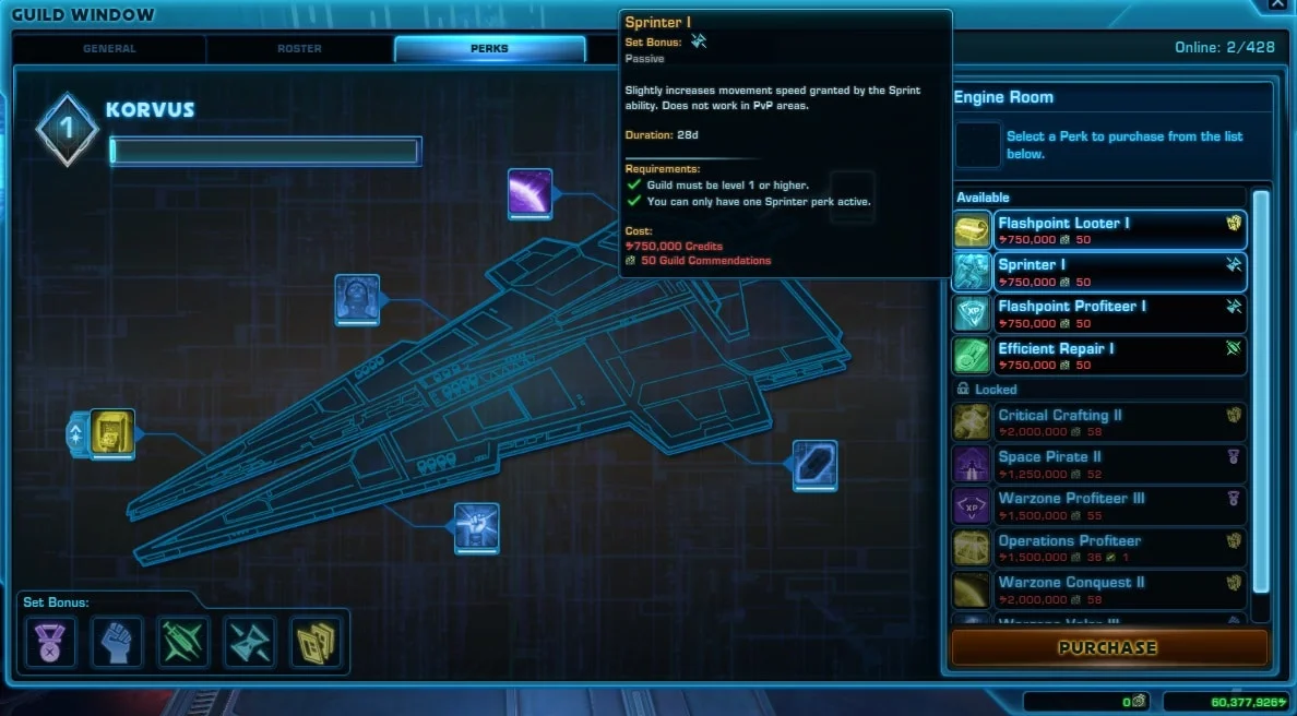 The Perks tab allows you to see what Perks are slotted in each Node and purchase new Perks (if you have appropriate permissions). You can find out more about the new Guild Perks System in my Guild Perks Guide.
