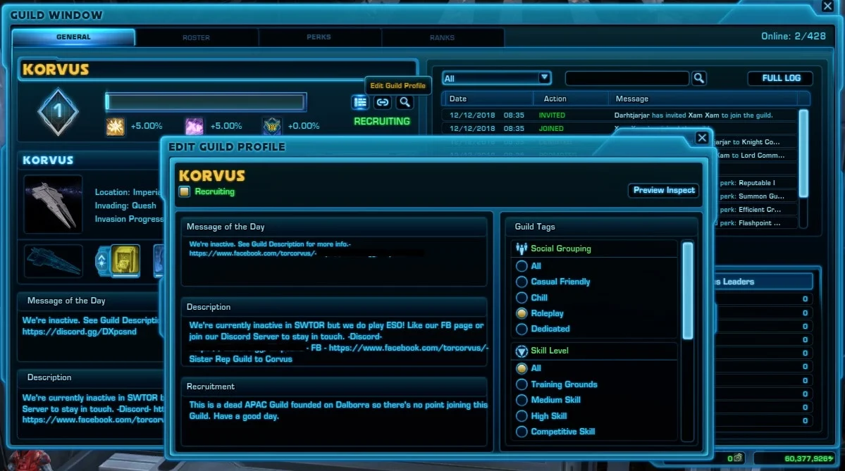 - Edit Guild Profile – Allows you to edit MotD, Description, Recruitment and Guild Tags