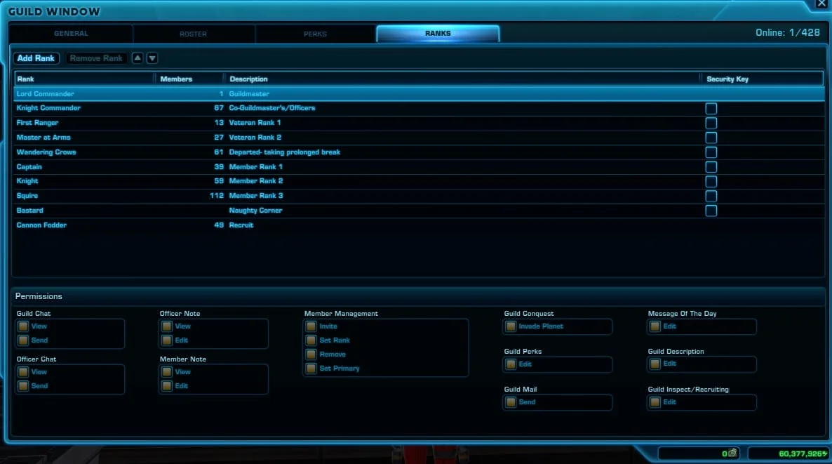 The Rank tab allows you to easily give permissions for various Guild related things by Rank. You can add, remove, rename and order ranks as you see fit. You can also indicate whether a Rank requires a Security Key or not. The max number of Ranks has been increased to 20.