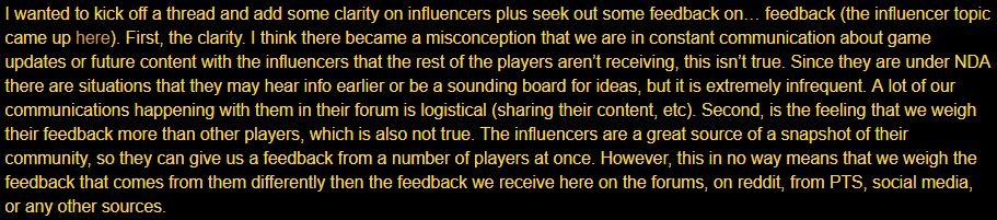 However, his response was not entirely satisfying to the forum community. They took what he said at face value and came up with some quite frankly bizarre assumptions. Most forum responders were furious that there was a secret private forum they didn’t have access to that they assumed the devs communicated in more regularly than in the public forums. This lead to some ridiculous theories and assumptions ultimately leading some to even blame the Influencers for the state the game is in.