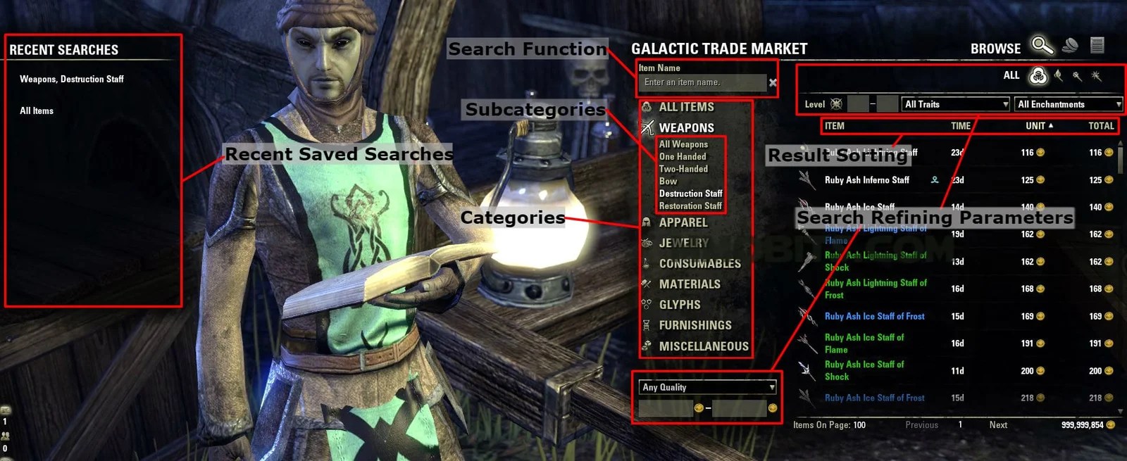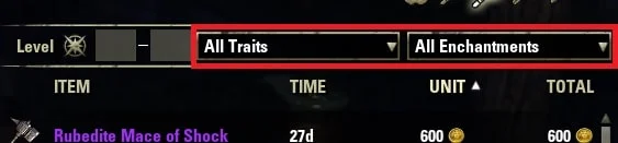 The Weapons, Apparel and Jewellery Categories have the option to refine your search via Traits and Enhancements. Clicking on either one shows a drop-down menu listing relevant Traits/Enchantments for each category.