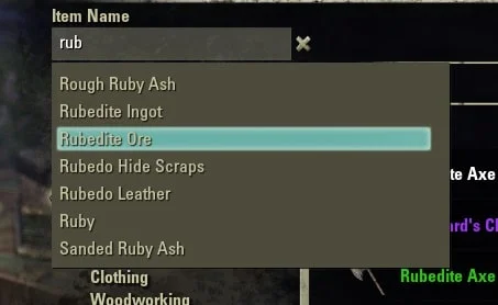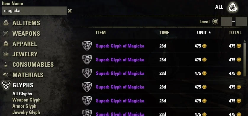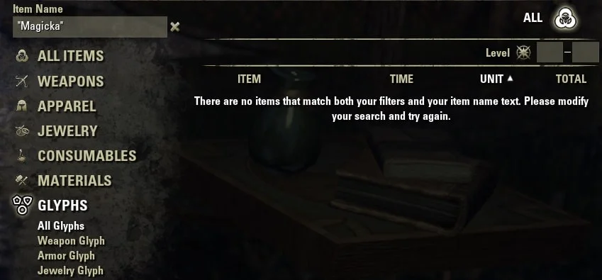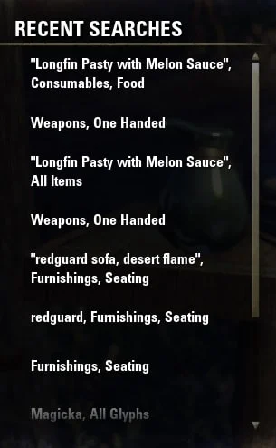 If you type a word into the search field then search it, it will show all items that include that parameter. For example, if you type ‘Magicka’ in the Glyphs category, it will bring up all the Glyphs with ‘Magicka’ in the name. If you enclose Magicka in quotation marks, it will not bring up any results as there is no Glypth just named Magicka.