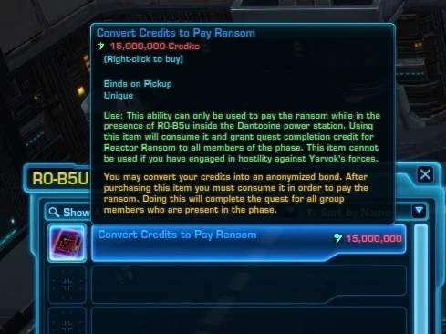 This achievement is discovered when you complete <The Easy Way> Achievement by paying the ransom in the Heroic 4 โReactor Ransomโ. You pay the Ransom by clicking on the Droid โRO-B5Uโ in the entrance area of the Heroic and purchasing the โConvert Credits to Pay Ransomโ item for 15 Million Credits.