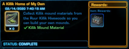 You need to collect 10 Killik mound materials from the Ruur Killik Hivewoods located in Kings Pass near Wardpost Luudes (Republic Base). Imperial players will have to travel south from Outpost Talarn to get there.
