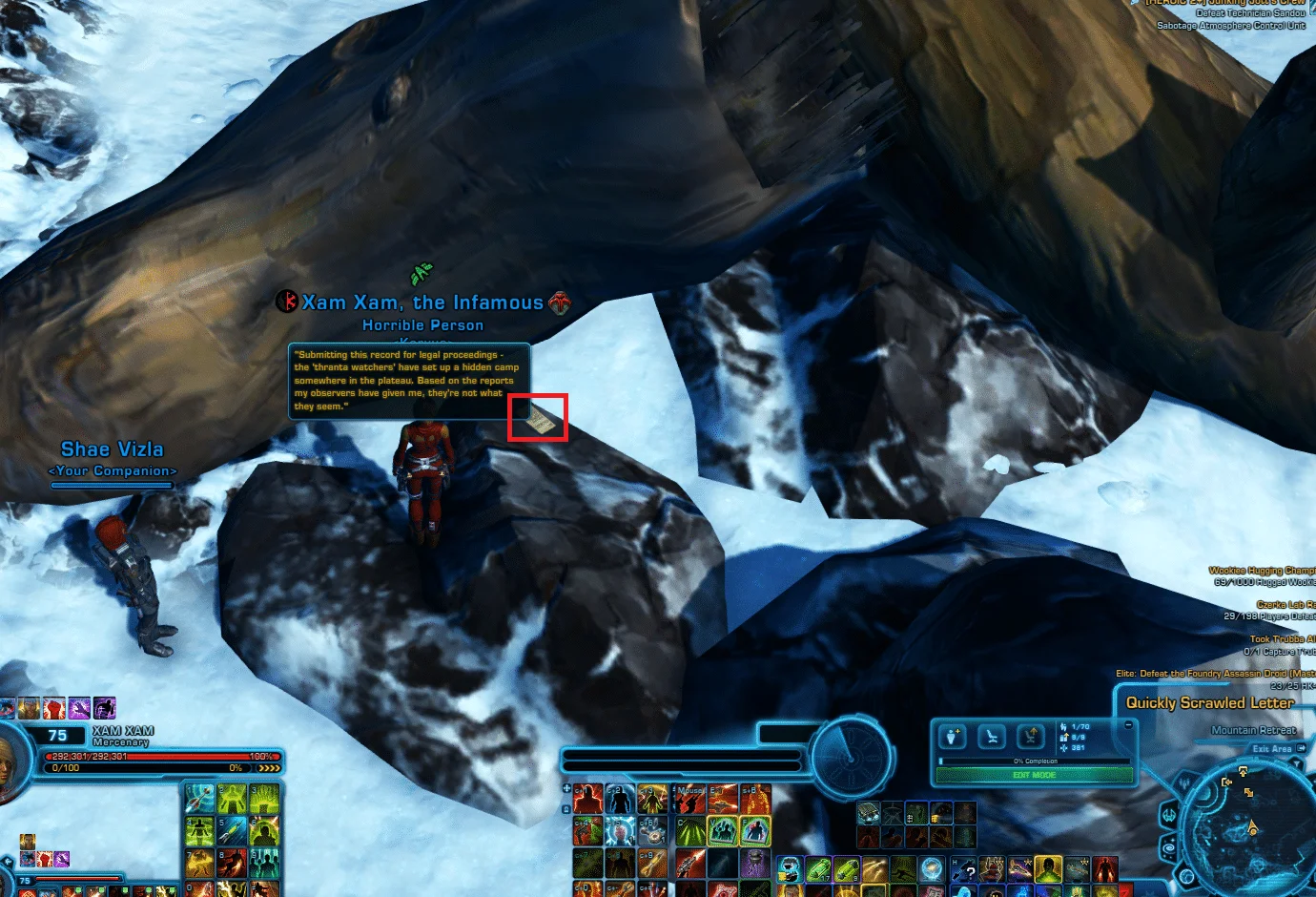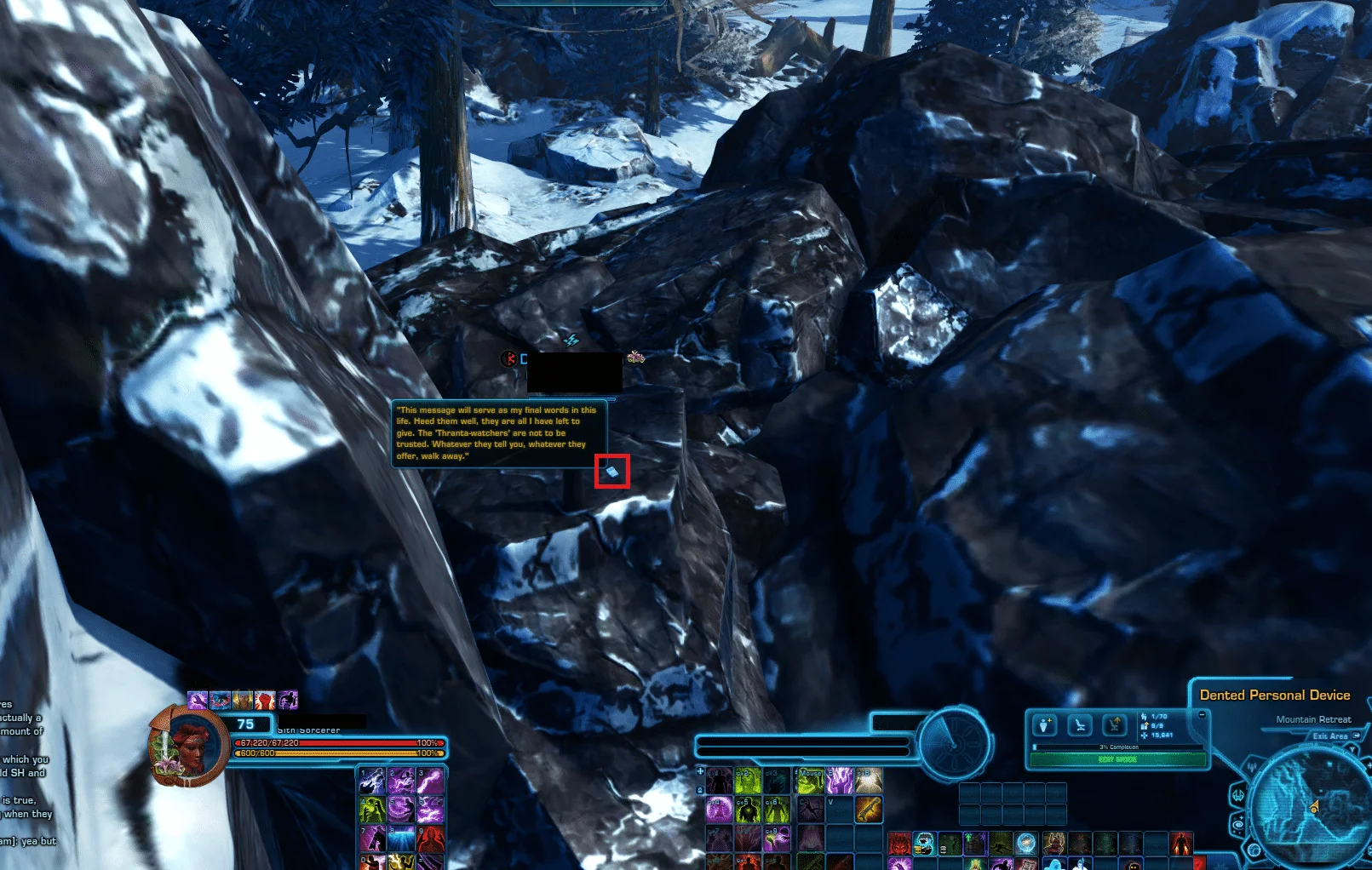 - A Note, Journal or Datapad by the broken tree, the ancient ruins or among rocks (Mountain Retreat)