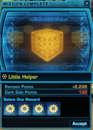 | Life Day: Goodness Gracious Me! | Soothe an overheating droid and received a gift during the Life Day event. | Daily |