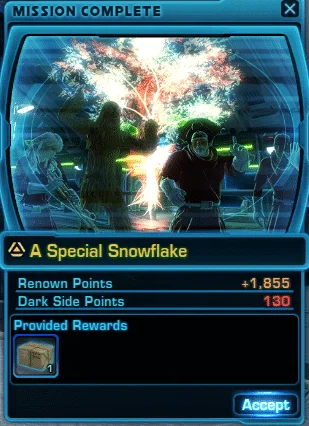 | *Life Day: Snowball Fight Eternal! | Oh, it is ON! Share the joy by completing the mission: A Special Snowflake numerous times (5) during the life Day event. | Infinite |