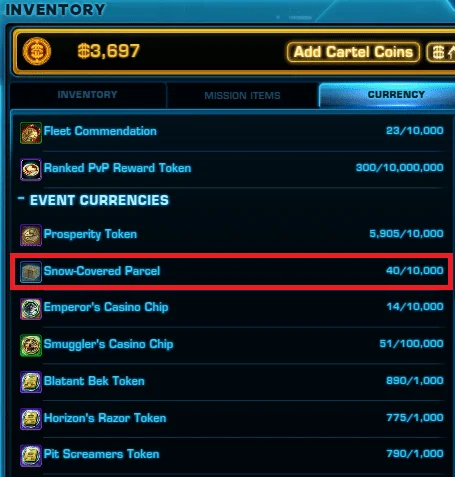 Snow-Covered Parcels are now a Legacy Event Currency. They are stored in the Currency Tab of your Inventory in the ‘Event Currencies’ section.