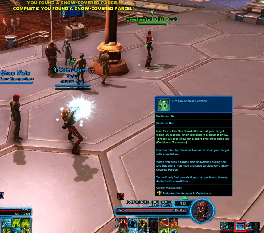 Then, put the Bomb or Cannon on a quickbar, target a player or NPC, then click on the ‘Life Day Snowball Bomb’ to throw it at your target. Note there is only a CHANCE that you will get a Snow-Covered Parcel.