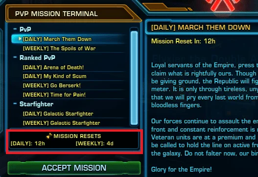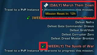 Dailies and Weeklies are now removed from your Mission Log if you do not complete them before the daily or weekly reset. Dailies and Weeklies that you have in your Mission Tracker will have an hourglass symbol next to them before you start them. You can hover over the symbol to see how much time you have left to complete a daily or weekly. When you’re at a Mission Terminal, it will also tell you how long it is until the Daily and Weekly reset.