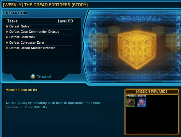 The PvP, Flashpoint, Uprising and Story Mode Operation Weeklies can now be completed up to 3 times per week per character. Daily and Heroic Weeklies can be completed twice per week.