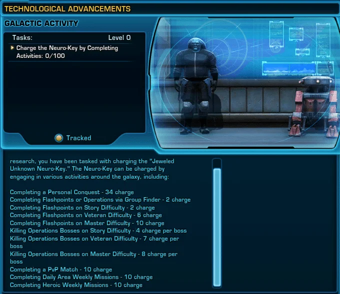 You are also better off holding off doing other activities such as Heroics/Dailies, PvP and Flashpoints until you are Level 80. You will not earn the new currencies or get new gear drops from any of the content mentioned above until you are Level 80. Once you're Level 80, you'll want to be doing Heroic and Daily Area Weeklies, along with your preferred content, to stay stocked up on Aquatic Resource Matrix.