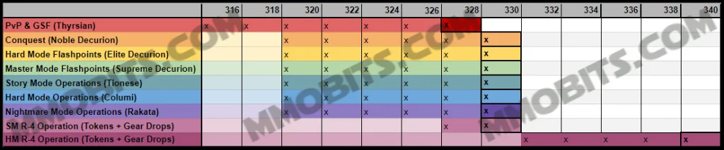 The following table demonstrates the item levels you can get from various content (click on it to enlarge). Where the colour ends for each content type (row) is the max item Level you can get from that content. For example, if you were to do the SM R-4 Operation and you’re full 334 Item Rating, you would still only get drops that are 330.