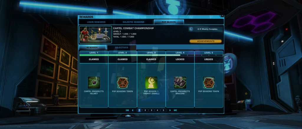 Is a new rewards system introduced in SWTOR Game Update 7.2. This rewards track is progressed by earning points which you get from completing Matches and Seasons Objectives. As you progress the reward track, you earn cosmetic rewards and a currency, PvP Seasons Tokens. You can use PvP Seasons Tokens to purchase additional cosmetic rewards from two different vendors.