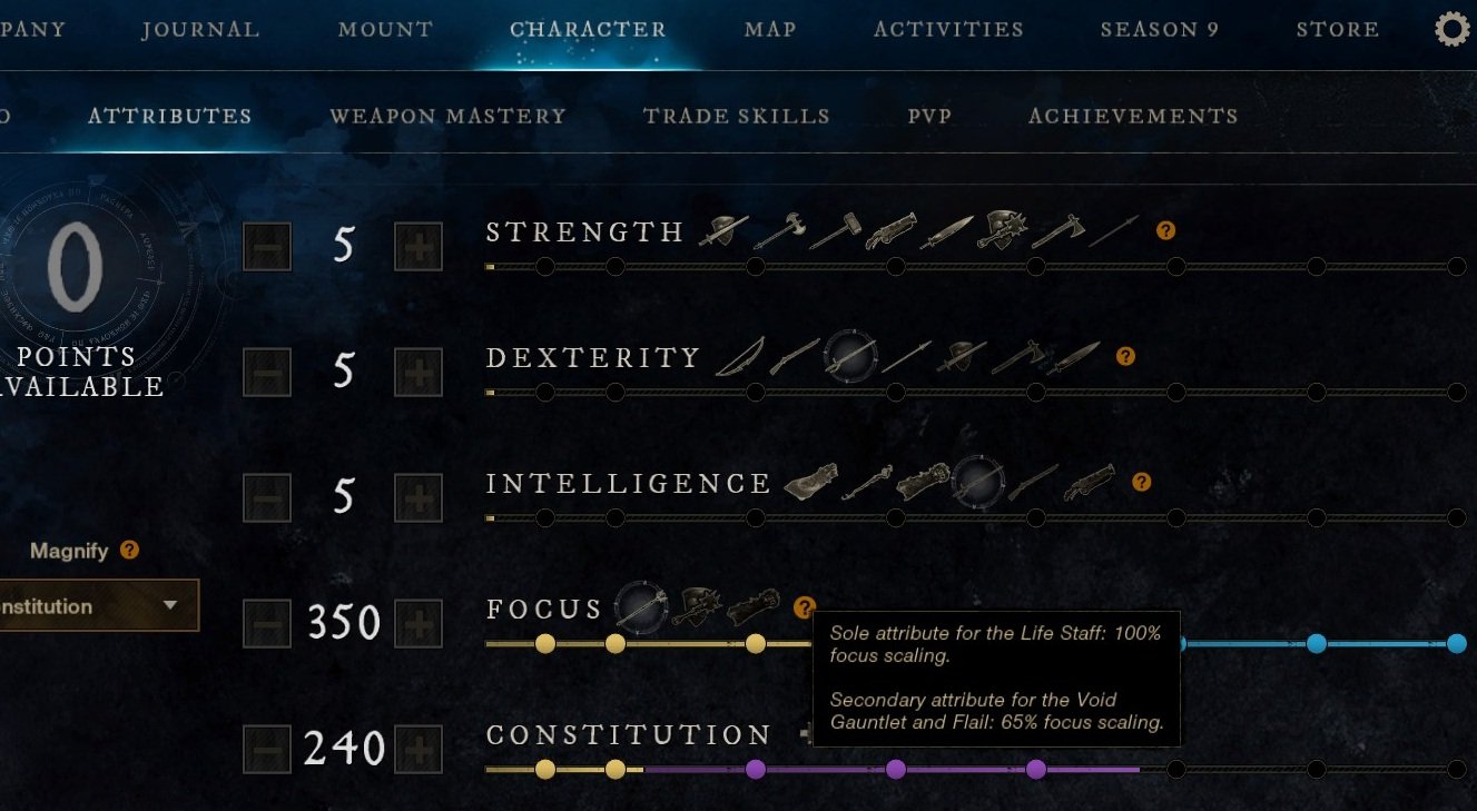 - You are Not Bound to Your Starting Archetype – New World does not have a Class System, instead you can pick any two weapons. You can go with any combination of weapons you like but keep in mind that different weapons scale with different stats. The Attribute Page (Character Menu) will show you what weapons scale with each of the Attributes. Hovering over the question mark icon will give you specific details.