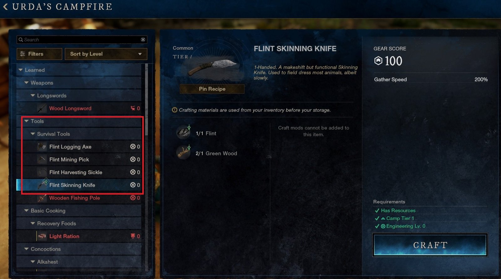 All you need to do is gather extra Flint and Wood from bushes when you’re on the ‘Basic Needs’ quest (at least 4 Flint and 4 Wood). Then you can go to the Watcher’s Campfire and craft a Flint Skinning Knife as well as a Flint Mining Pick, Flint Harvesting Sickle and Flint Logging Axe. Make sure you equip them.