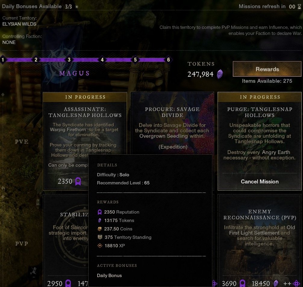 If you’re maxed out on Faction Tokens, you can do Faction Missions to earn some extra Gold. Soloable PvE missions that reward the most Gold (237.50) are located in Cutlass Keys and Elysian Wilds. Keep in mind that some Cutlass Keys PvE Missions require you to go into the Free for All PvP area (since they’re PvE Missions, they won’t reset on death). Some Elite PvE missions in other zones such as Brimstone Sands or Ebonscale Reach will also reward 237.50 Gold.
