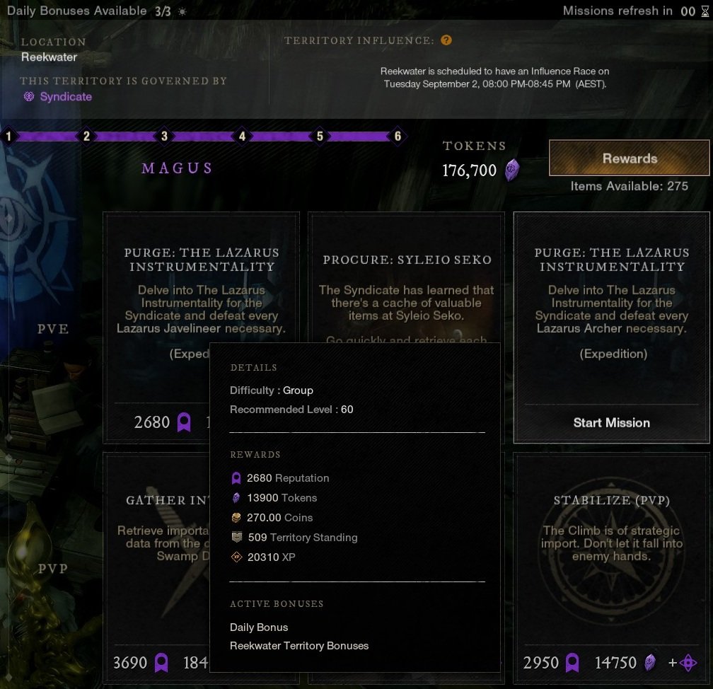 For those of you who enjoy Expeditions, you can grab the Expedition missions that pop up instead. Expedition Missions generally give more Gold than solo PvE Missions (amount varies depending on zone). Cutlass Keys also sometimes has Missions for the Hive of the Gorgon Raid.