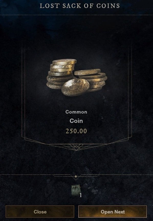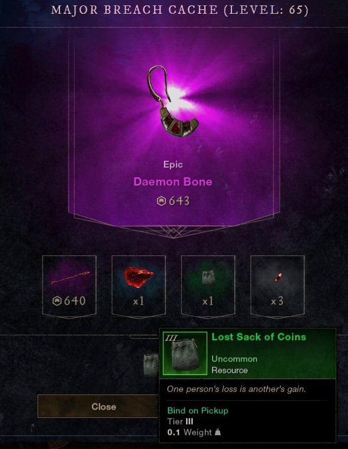 Completing Major Corrupted Portals rewards you with a Major Breach Cache. The first two caches you open will contain a Lost Sack of Coins with 250 Gold in them.