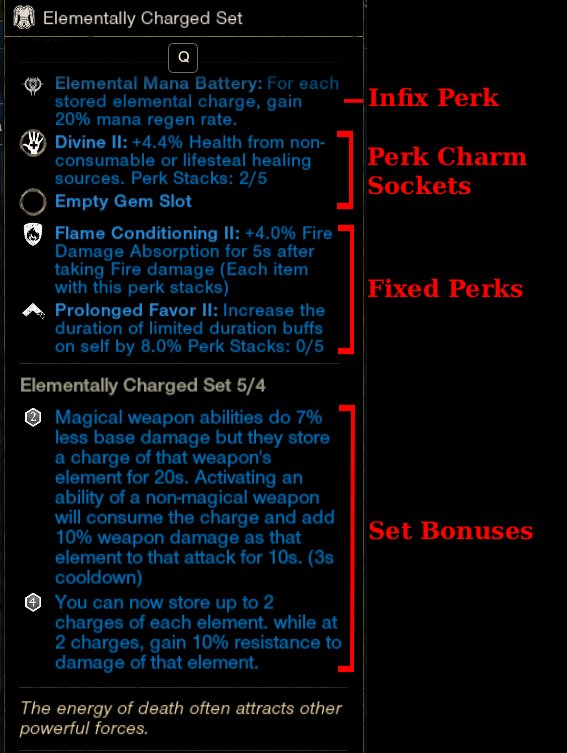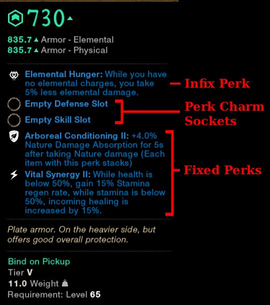 Instead of having an attribute perk and 1-3 other Fixed Perks, perks will roll on gear a bit differently now. Attribute perks have been removed from the game. There will still be Fixed Perks (revamped) along with four different Perk Charm slots which will roll at random with some rulesets. Most generic gear in the game will now have a mix of up to two Fixed Perks and up to three Perk Charm Slots.
