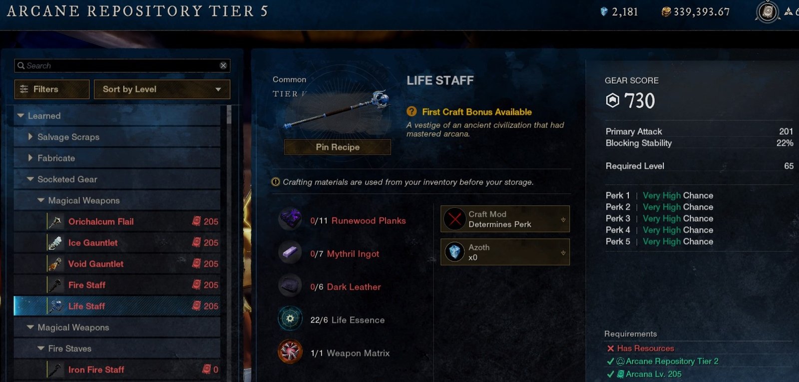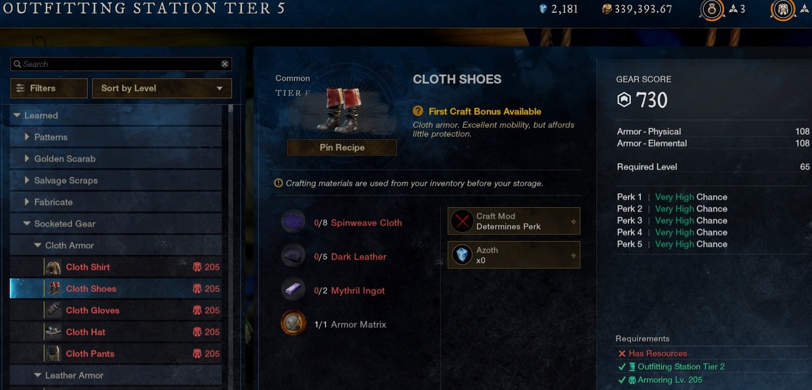 Materials needed to craft Perk Slot Gear includes various Tier V materials, one Armour, Weapon or Jewellery Matrix and other unique materials in select cases.